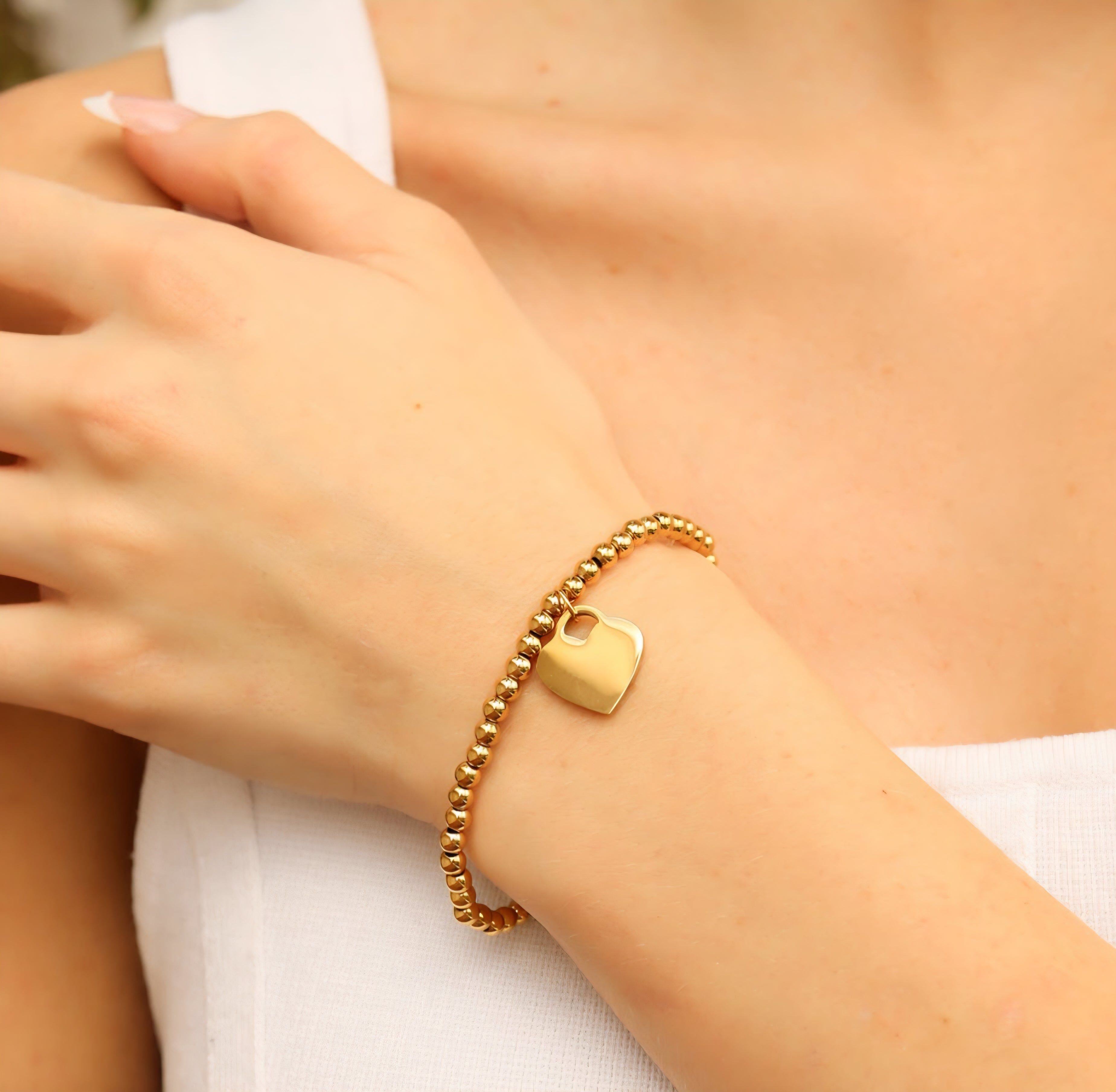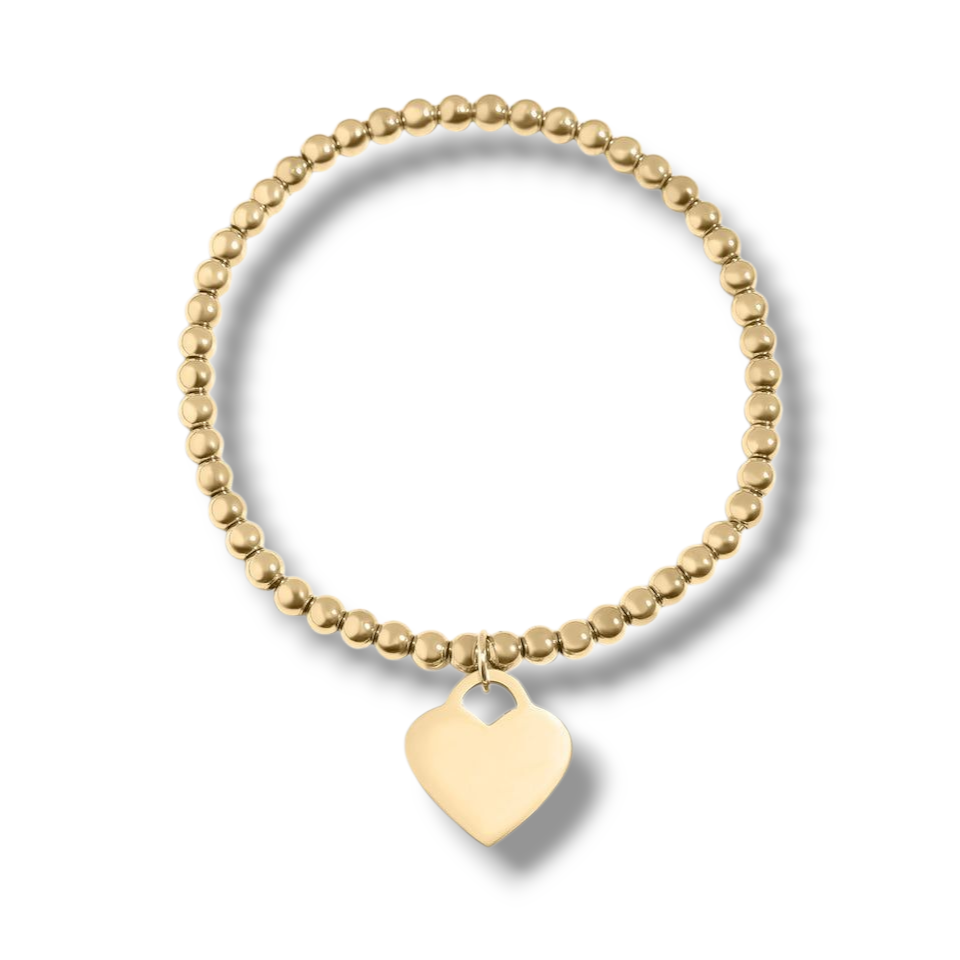 18K Gold PVD Stainless Steel Beaded Heart Stretch Bracelet. (Engraved)