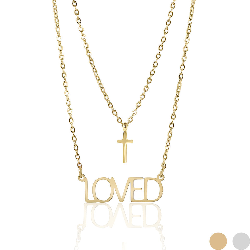 18K Gold PVD Stainless Steel "Loved" Layered Cross Charm Necklace