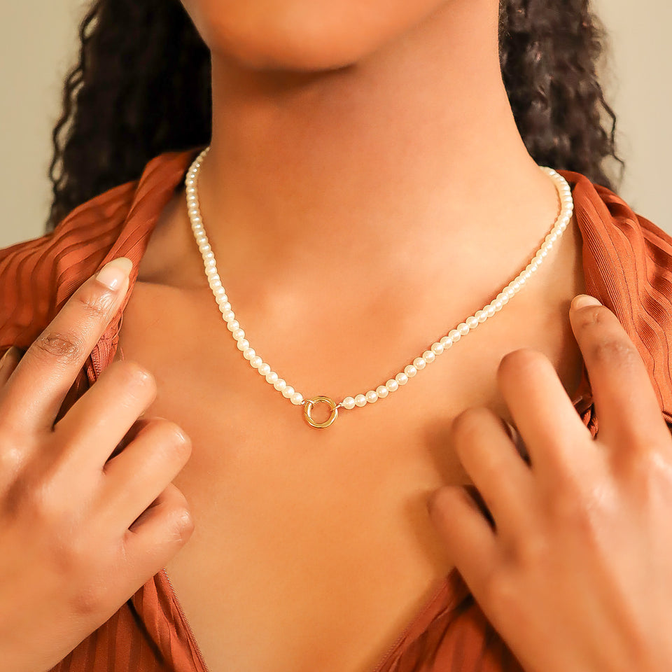 18" Glass Pearl Necklace with Stainless Steel Charm Keeper